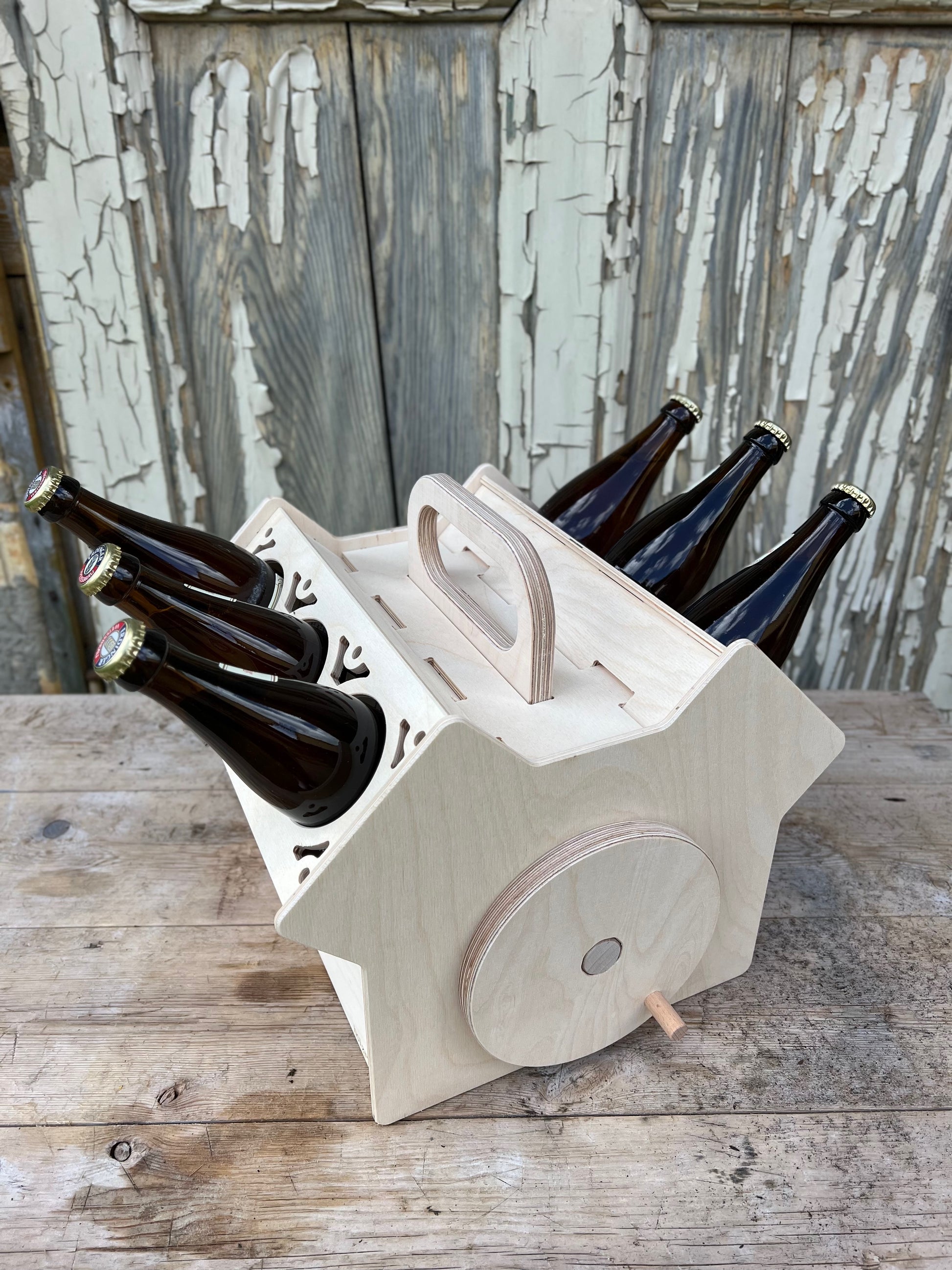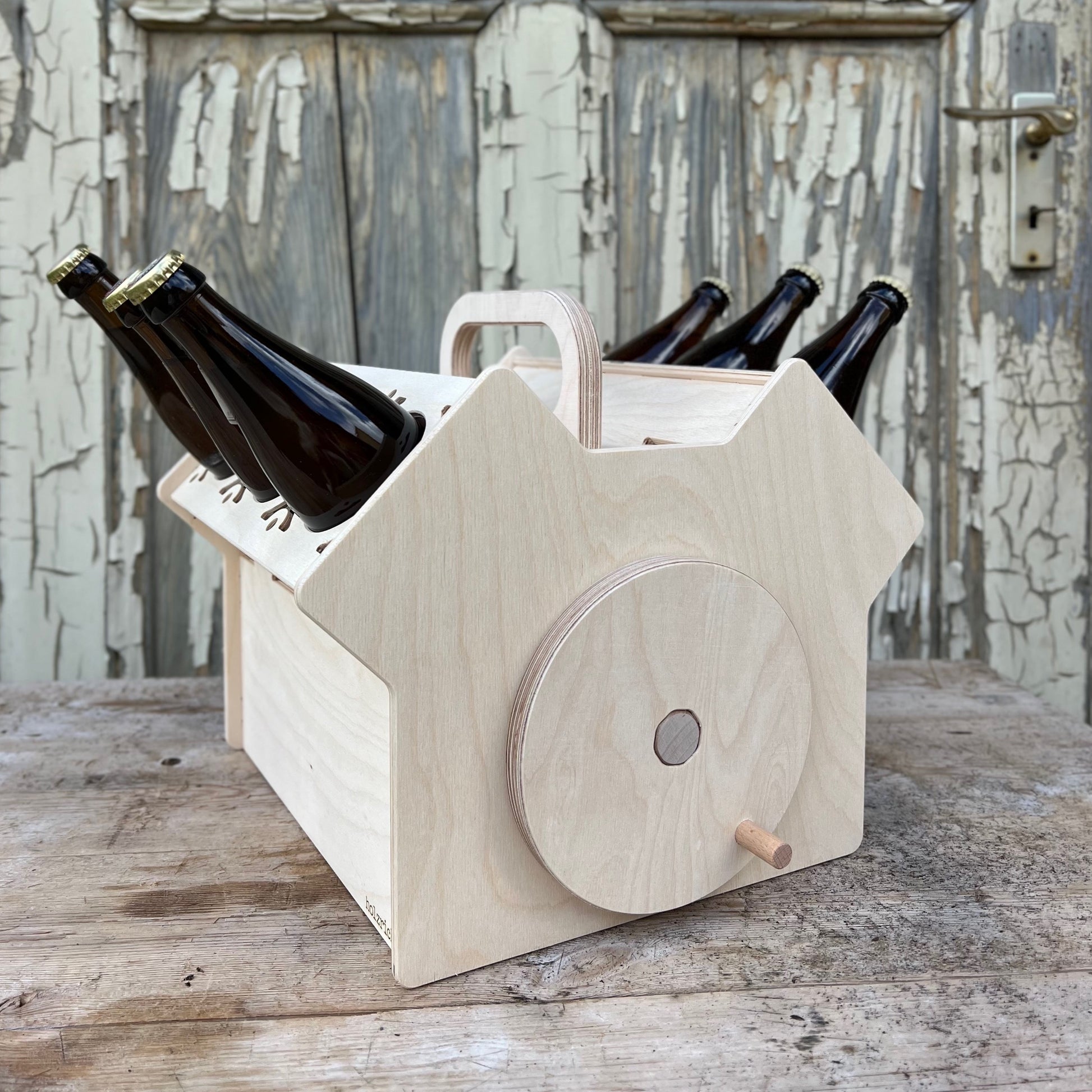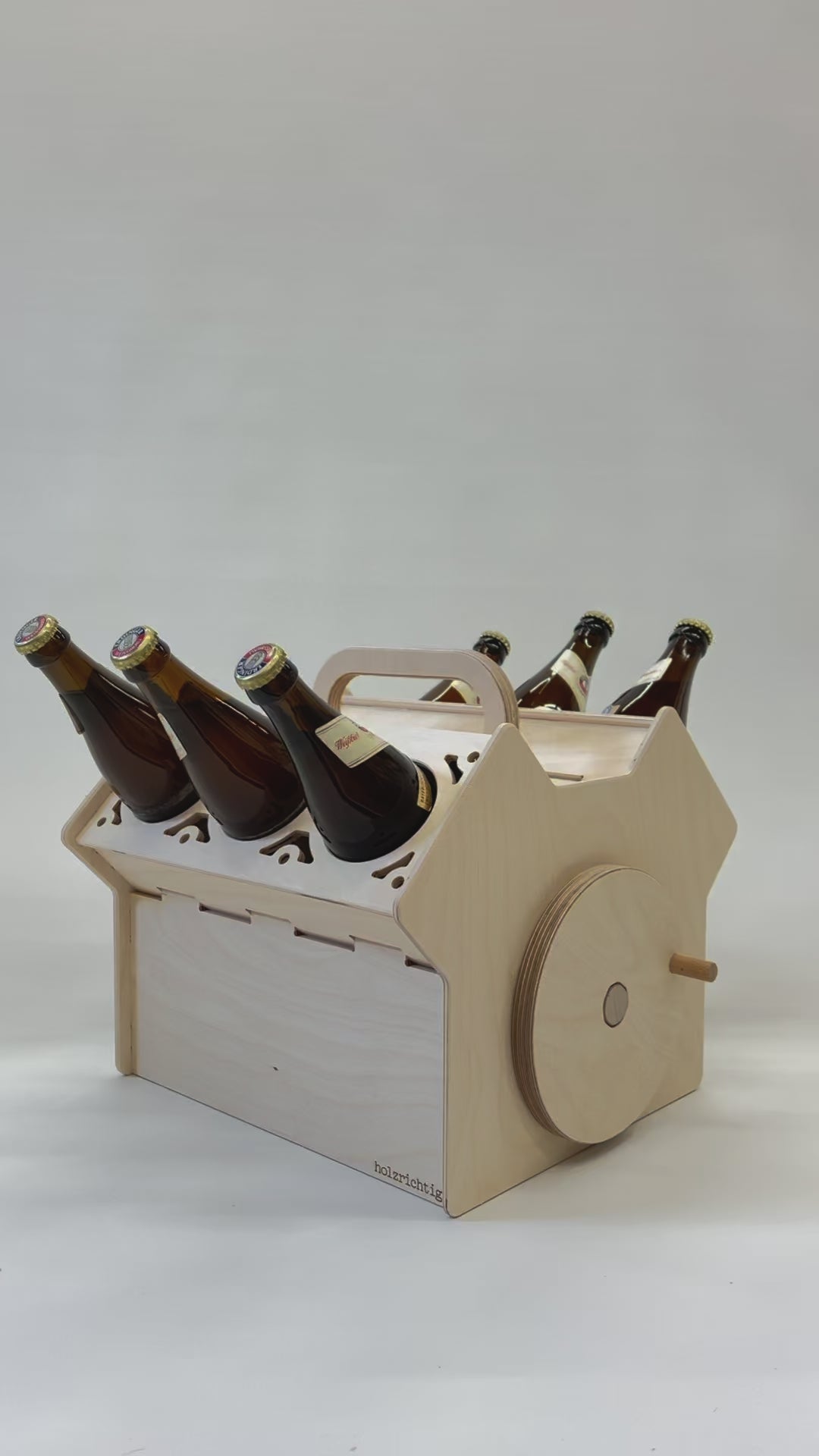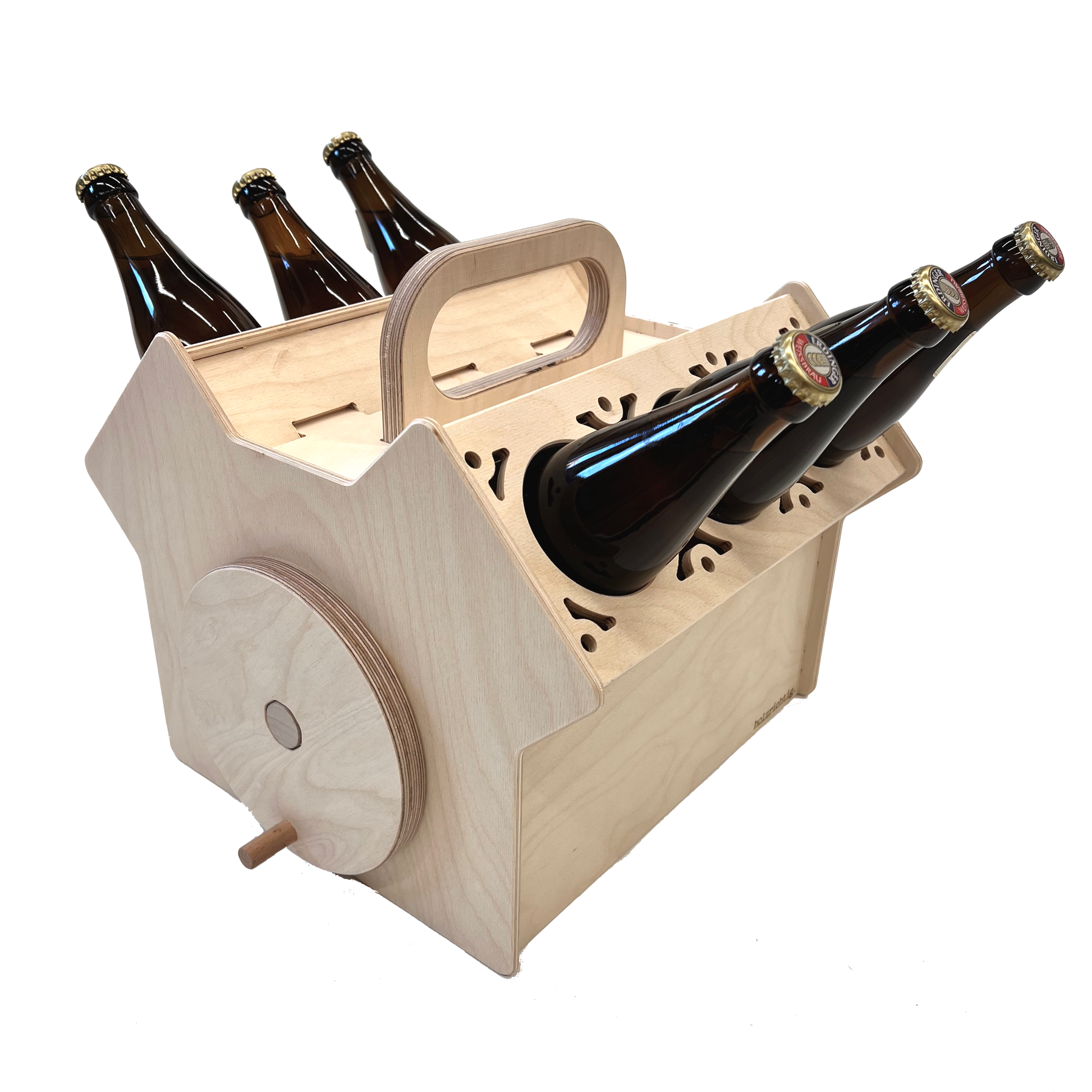 Der Körper der Bierkiste besteht aus hochwertigem Birke Multiplex, das auf modernsten CNC-Fräsmaschinen präzise bearbeitet wurde. Jede Sichtkante ist leicht gerundet, um ein angenehmes und ansprechendes Erscheinungsbild zu gewährleisten.